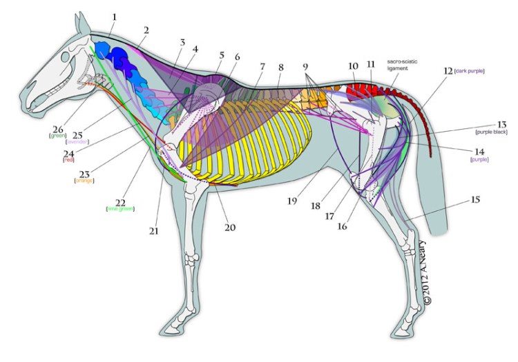 Shown below, is a diagram of the horse. Included are muscles – mostly represented by lines, some with a transparent extension for simplicity – that are primarily involved with ‘initial’ motion.