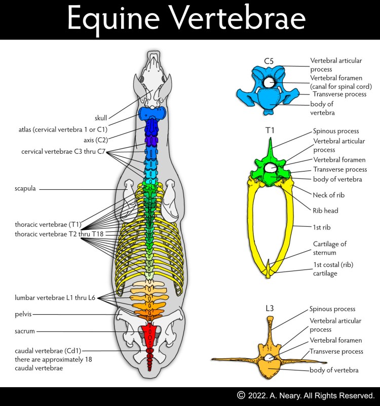 The following illustration provides a top view of the horse’s vertebrae with the skull, scapula (shoulder blades), and pelvis. There are also views of the 5th cervical, 1st thoracic, and 3rd lumbar vertebrae showing the hole (foramen) through which the spinal cord fits.
