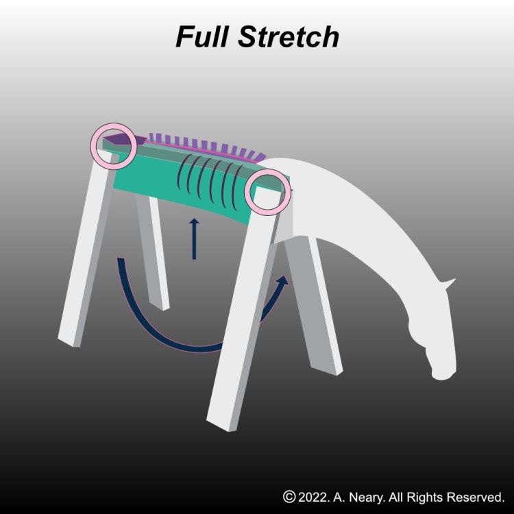 The stretch as a foundation allows the joints, shown by the circles, to remain open and free, while stretching the topline. This in turn, allows space for the spinous processes of the vertebrae to move as they’re supposed to while the back muscles are strengthened.