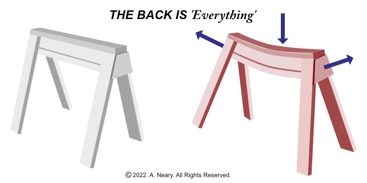 Initially, being unaccustomed to its pressure, the back hollows slightly when weight is placed on it. A consequence is the tilting ‘inward’ of the pelvic and shoulder girdles, angling the hind legs backward and the front legs forward. The saw horse on the left represents a body that is strong and full of potential. The depiction on the right helps us visualize what happens when weight is placed on a spine that is young and impressionable. A young horse tends to ‘go above the bit’ because they aren’t used to the weight and pressure (Arabians are generally an exception).