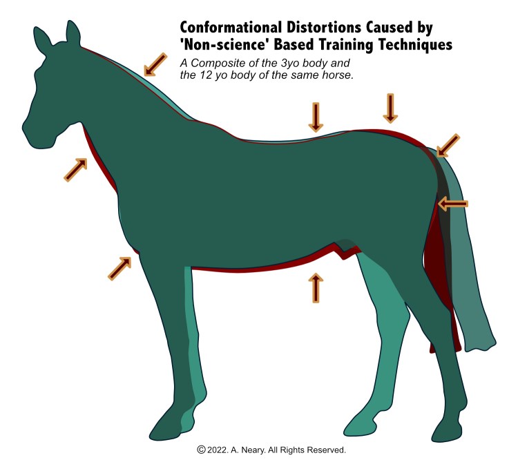 The curled neck and the weakened back unwittingly promoted micro-tensions to build and accumulate. There’s just no way a rider or trainer can state that the over-bend method will produce a properly balanced horse, especially as tail swishing lead changes, ear pinning, wrinkled nostrils, evident stress and tension, four beat canter pirouettes, and labored piaffes dominate arenas everywhere as a result. It took nine years of ‘benign neglect’, shameless ambition and a blind eye to the obvious, to render the horse depicted above, to the state of dysfunction and discomfort he suffered with.